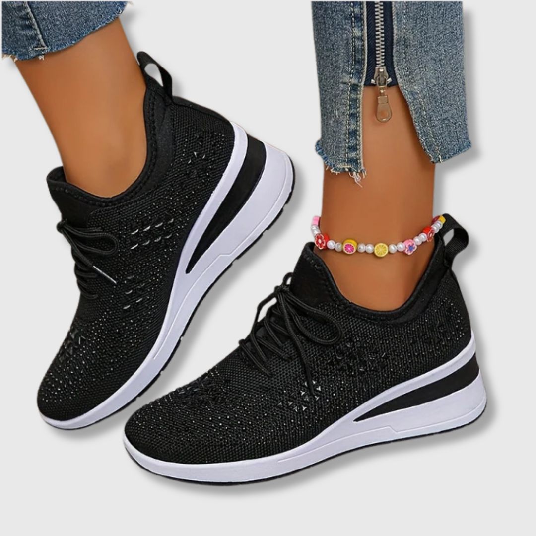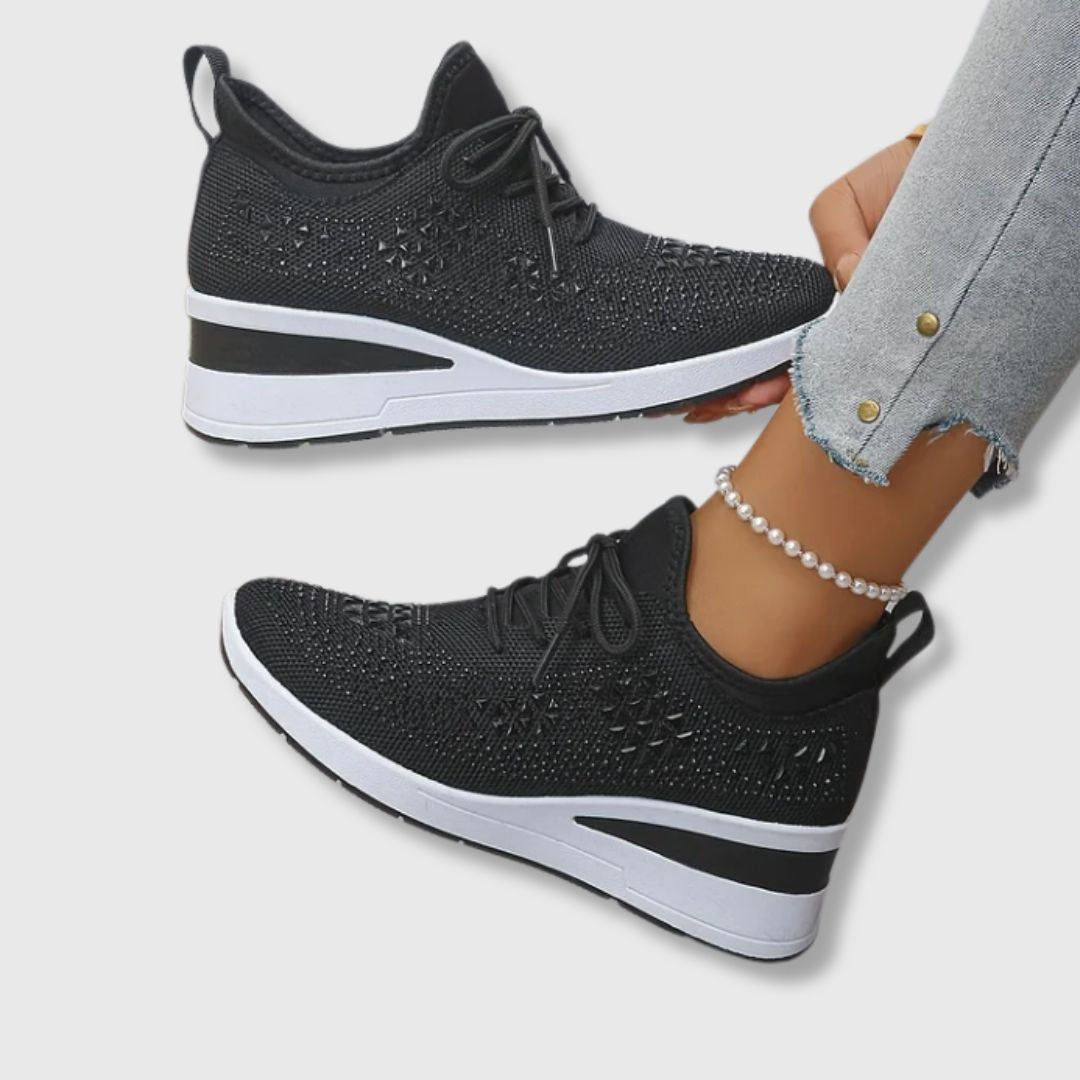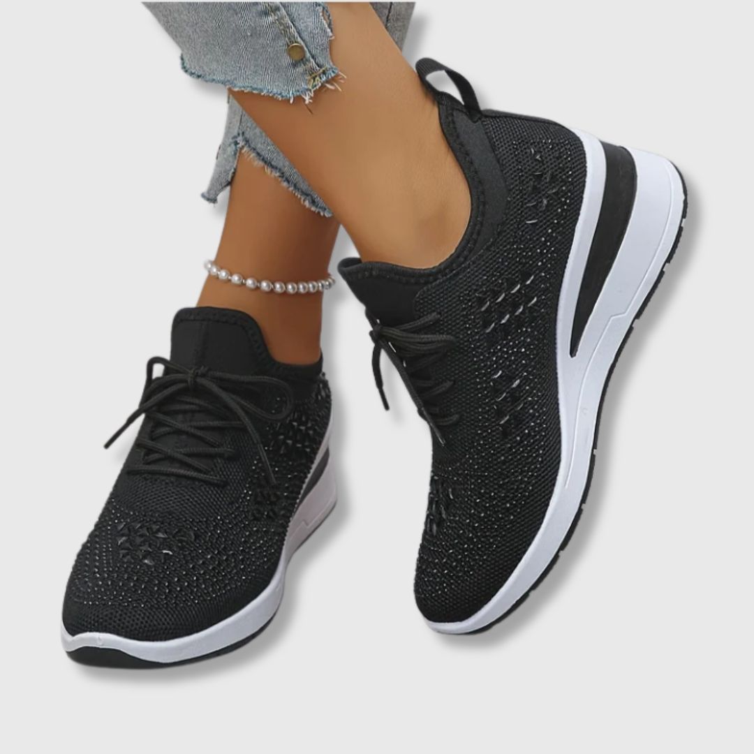 - Dizájn: légáteresztő szövött felsőrész, finoman megemelt sarok, párnázott talp boltozati támaszszal, visszafogott csillogó részlet