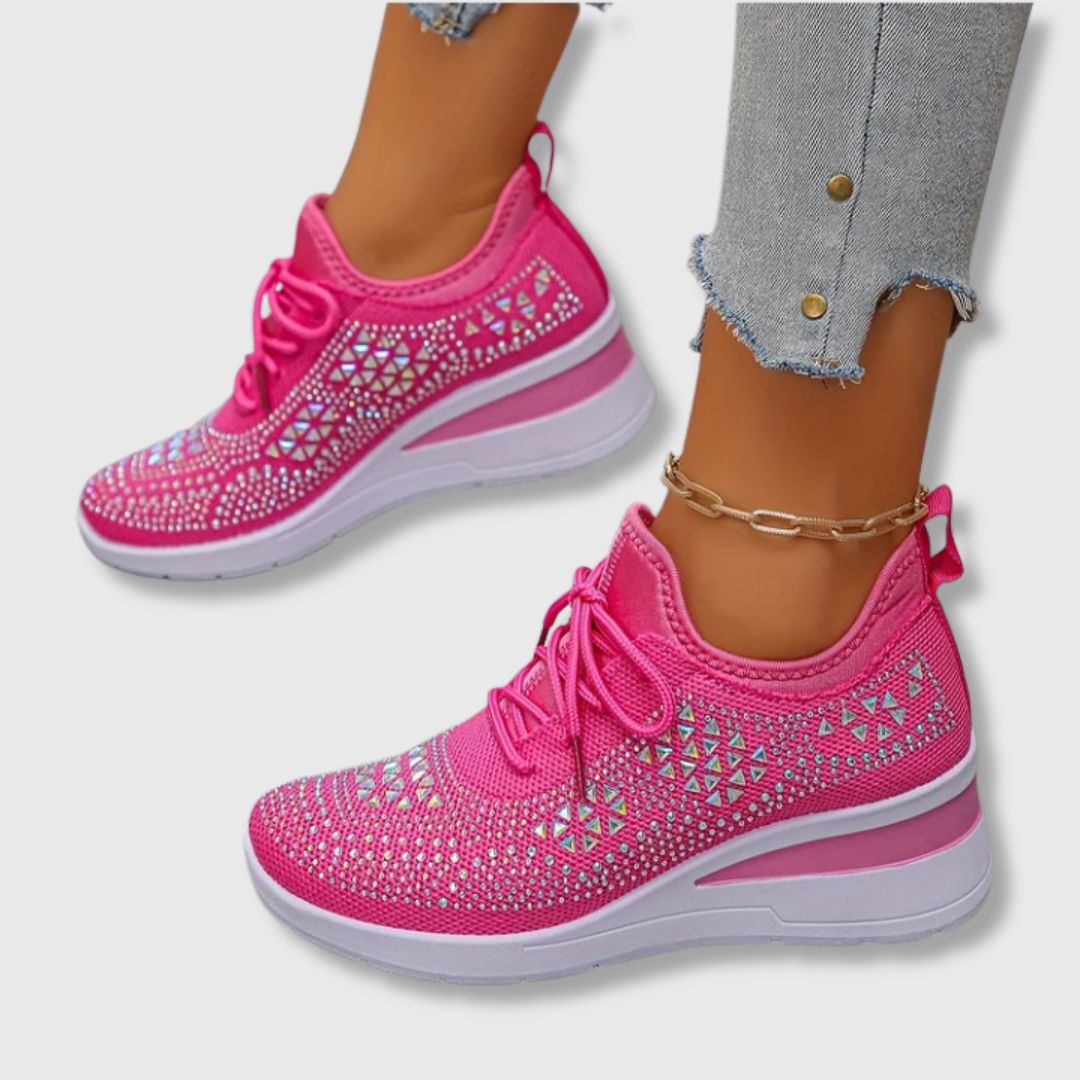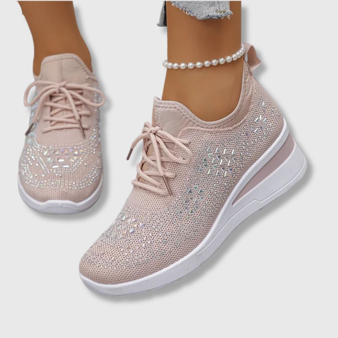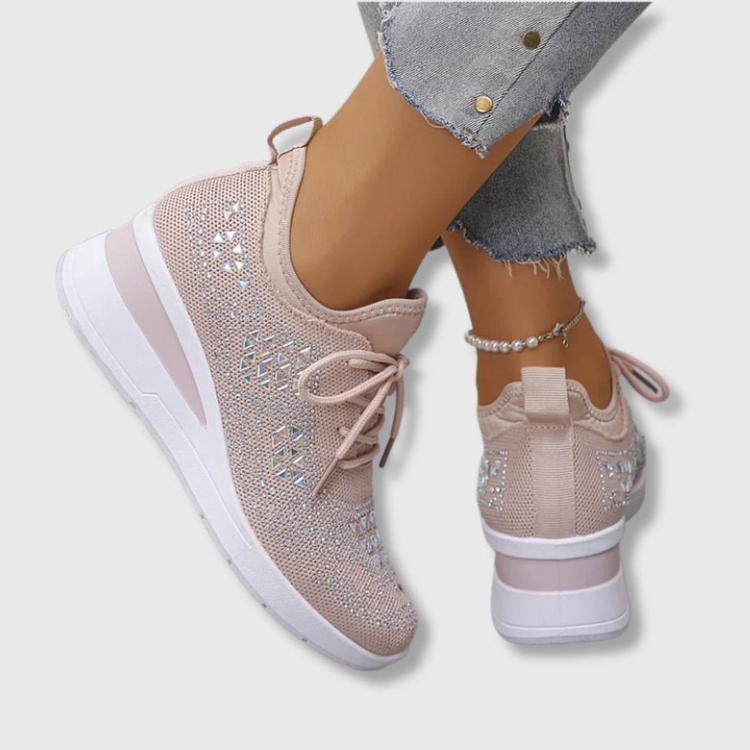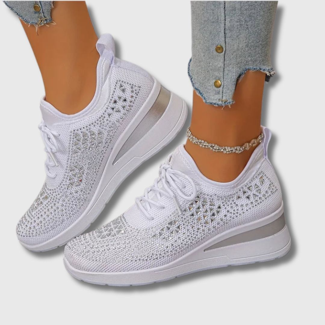 - Dizájn: légáteresztő szövött felsőrész, finoman megemelt sarok, párnázott talp boltozati támaszszal, visszafogott csillogó részlet